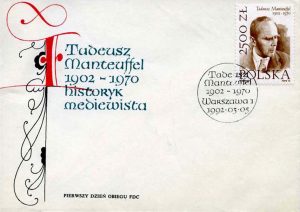 Tadeusz Manteuffel led Institute of History PAS until his passing. He died in Warsaw on 22 September 1970 and was buried in the Avenue of Notables of the Warsaw Powązki Cemetery. Author of the university handbook Historia powszechna. Średniowiecze [A Universal History. The Middle Ages], which was printed in several editions, his best known work was Narodziny herezji. Wyznawcy dobrowolnego ubóstwa w średniowieczu [The Birth of a Heresy: Voluntary Poverty and its Professed Adherents in the Middle Ages] (three editions in Poland, two in Italian, as well as translations into French and German). In 1976, the commemorative book Historyk wobec historii. Rozprawy nieznane, pisma drobne, wspomnienia [A Historian and History. Unknown publications, contributions and memoirs] was published (edited by Manteuffel’s student, Stanisław Trawkowski). In 1982, a street in the Warsaw district of Gocław was named after him. Institute of History PAS has borne the name of Tadeusz Manteuffel since 1994, and a plaque was unveiled in 2012 on the façade of the Institute’s seat in Warsaw Old Town Square to commemorate its originator.