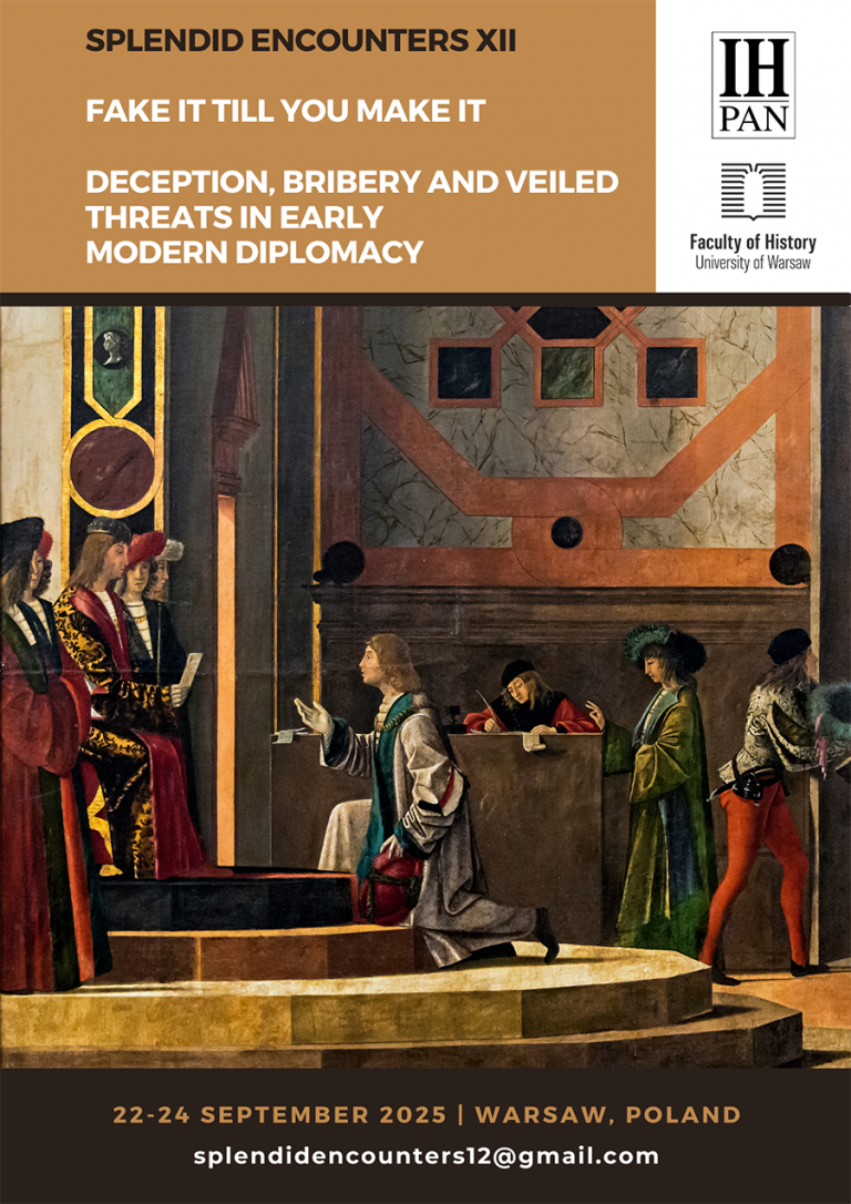 Splendid Encounters is a series of international and interdisciplinary conferences that aims to bring together scholars from different fields of study to consider diplomacy and diplomatic activities in the early modern period within the broadest possible framework. After eleven successful meetings in, among others, Vienna, Florence, Bath, Budapest, Prague, and Lisbon, we invite you to join us for another event, this time co-hosted by the University of Warsaw, Department of History and the Institute of History of Polish Academy of Sciences..