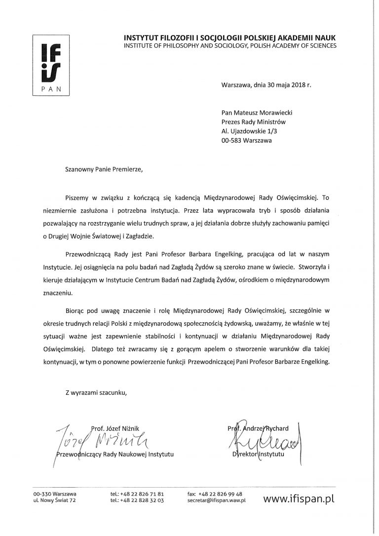 W imieniu prof. Andrzeja Rycharda, Dyrektora Instytutu Filozofii i Socjologii PAN, uprzejmie informujemy, że za pośrednictwem portalu petycjeonline.com IFiS PAN prosi o wyrażenie poparcia dla listu wysłanego do Prezesa Rady Ministrów Mateusza Morawieckiego przez prof. Andrzeja Rycharda, Dyrektora Instytutu Filozofii i Socjologii PAN, i prof. Józefa Niżnika, Przewodniczącego Rady Naukowej Instytutu, w sprawie utrzymania stabilności Międzynarodowej Rady Oświęcimskiej oraz ponownego powołania profesor Barbary Engelking na Przewodniczącą Rady.