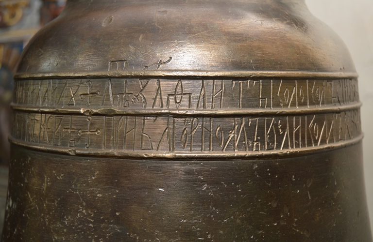 Inskrypcja w pełnym tłumaczeniu brzmi: „† Roku 7039 (1531 r.) odlany dzwon ten dla klasztoru Dającej Życie Trójcy, Mikołaja Cudotwórcy, Opieki Świętej Bogurodzicy i Kapłana Michała †przy pobożnym wielkim księciu całej Rusi Wasylu Iwanowiczu, przy arcybiskupie Nowogrodu Wielkiego i Pskowa władyce Makarym i przy Ihumenie Hiobie”.