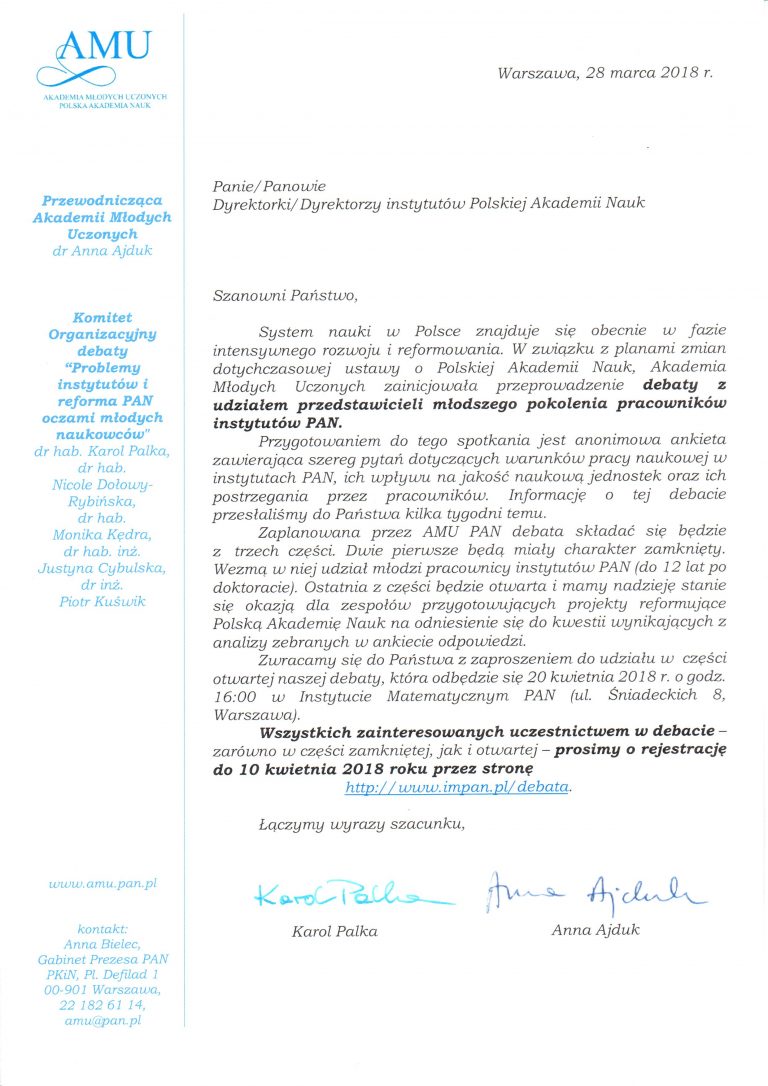 Na prośbę dr Anny Ajduk, Przewodniczącej Akademii Młodych Uczonych (AMU), zapraszamy do rejestracji na debatę „Problemy instytutów i reforma PAN oczami młodych naukowców”, która odbędzie się 20 kwietnia o godz. 16:00 w Instytucie Matematycznym PAN.