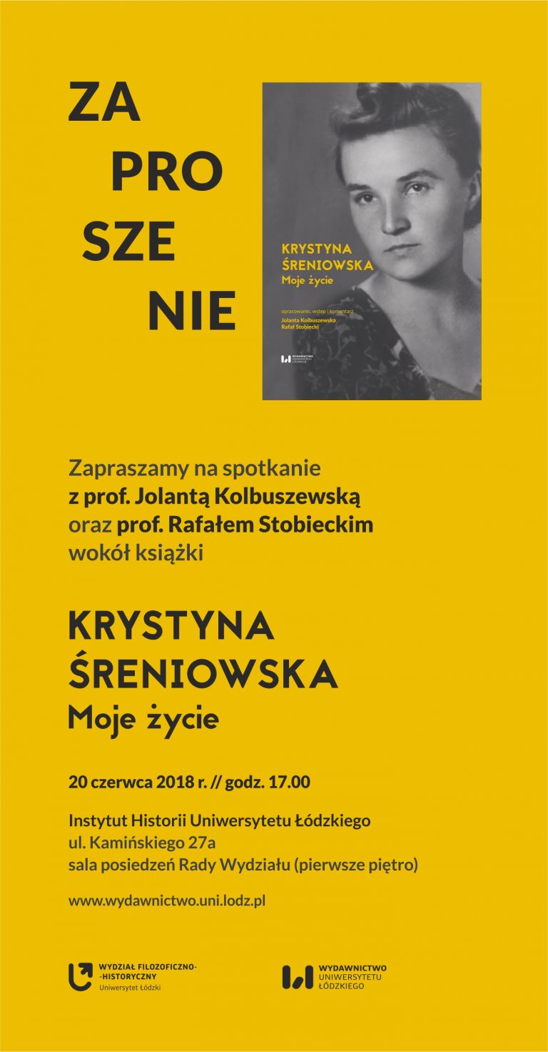 Serdecznie zapraszamy na spotkanie promocyjne pamiętników prof. Krystyny Śreniowskiej pt. Moje życie, które odbędzie się 20 czerwca (środa) o godz. 17.00 w Instytucie Historii Uniwersytetu Łódzkiego.